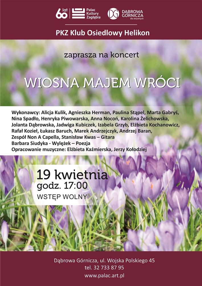 W Klubie Osiedlowym Helikon odbędzie się na koncert Wiosna majem wróci, na którym usłyszymy radosne i optymistyczne piosenki przeplecione poezją o tematyce wiosennej autorstwa Barbary Siudyki-Wylężek. Wykonawcami utworów muzycznych są soliści i instrumentaliści na co dzień związani z klubem. Koncert odbędzie się 19 kwietnia o godz. 17:00.