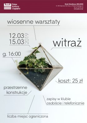 W Klubie Osiedlowym Helikon działa pracownia witrażu, a oprócz regularnych zajęć odbywają się tam także warsztaty tematyczne. Tym razem, 12 i 15 marca o godz. 16:00, tematem będą przestrzenne konstrukcje - małe terraria, oryginalne ozdobne bryły. Liczba miejsc ograniczona. Zapisy i informacje w klubie, osobiście i telefonicznie. Koszt udziału: 25 zł.