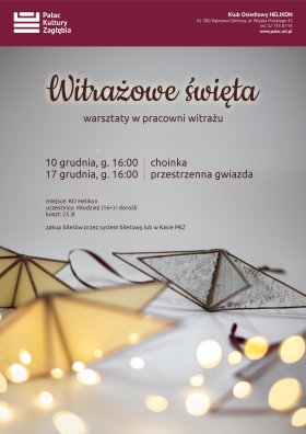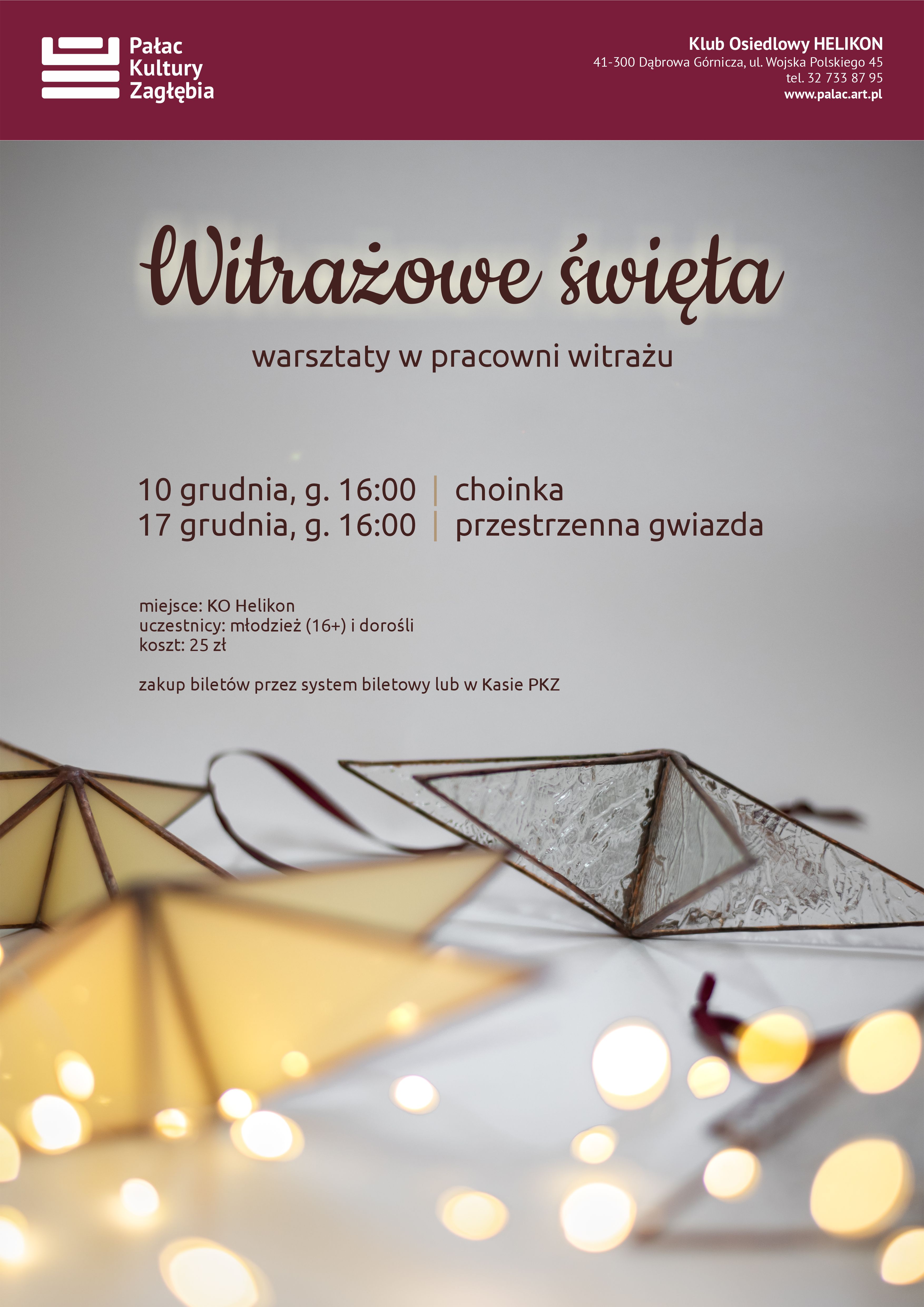 Pracownia witrażu zlokalizowana w Klubie Osiedlowym Helikon zaprasza na wyjątkowe warsztaty witrażu z magią świąt w tle. Warsztaty odbędą się 17 grudnia o godz. 16:00. Uczestnicy wykonają choinkę lub przestrzenną gwiazdkę, a szklane dzieła będą mogły zdobić mieszkania podczas świątecznego okresu.