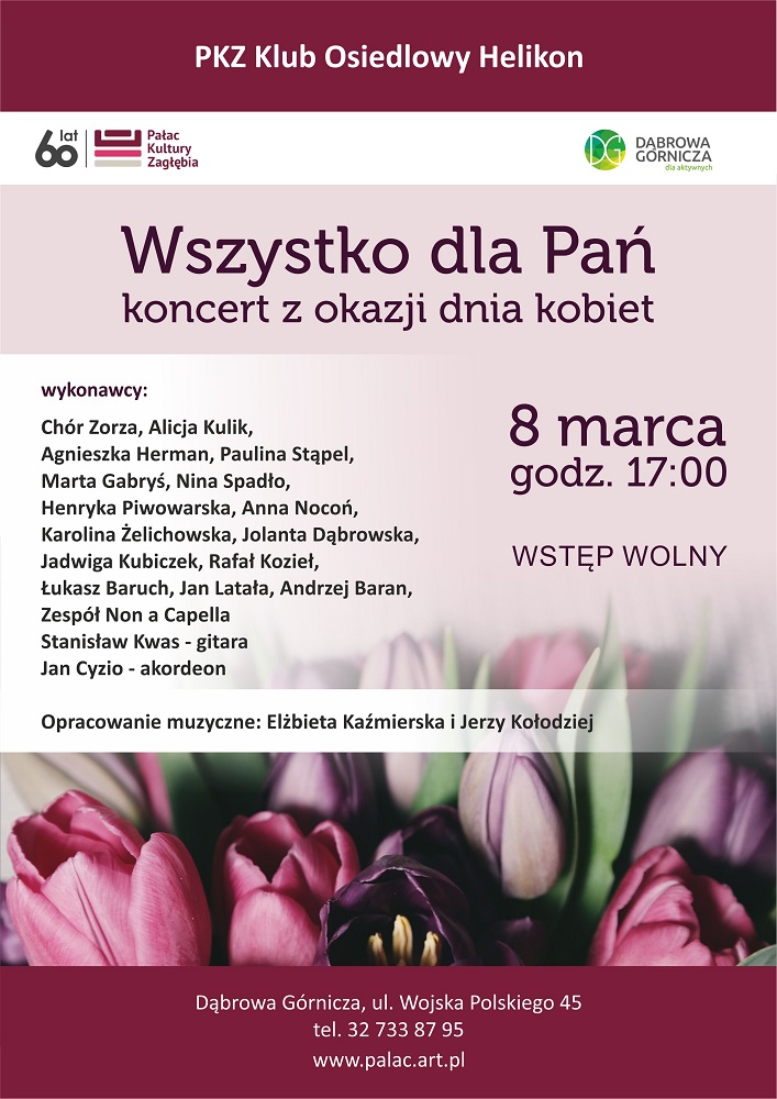 Z okazji zbliżającego się Międzynarodowego Dnia Kobiet, Klub Osiedlowy Helikon zaprasza swoich fanów do wspólnego spędzenia tego radosnego dnia. 8 marca o godz. 17:00 na wszystkich chętnych czeka koncert, na którym będzie można usłyszeć znane przeboje muzyki operetkowej, popowej, folkowej i wielu innych. Wykonawcami będą chór Zorza oraz soliści i instrumentaliści związani na co dzień z klubem. Całość została przygotowana przez Elżbietę Kaźmierską i Jerzego Kołodzieja.