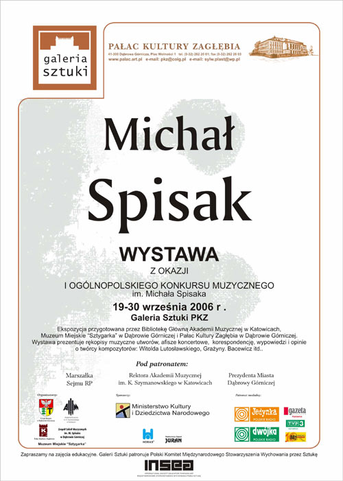 Ekspozycja przygotowana ze zbiorów Biblioteki Głównej Akademii Muzycznej im. Karola Szymanowskiego pozwala przedstawić osobowy i artystyczny portret kompozytora Muzeum Miejskie „Sztygarka” w Dąbrowie Górniczej włączyło się w przygotowanie ekspozycji udostępniając portret artysty pędzla Andrzeja Wojtali i ksero dokumentów z życia Michała Spisaka. Pałac Kultury zapewnił wystawie odpowiednią oprawę udostępniając Galerię Sztuki.