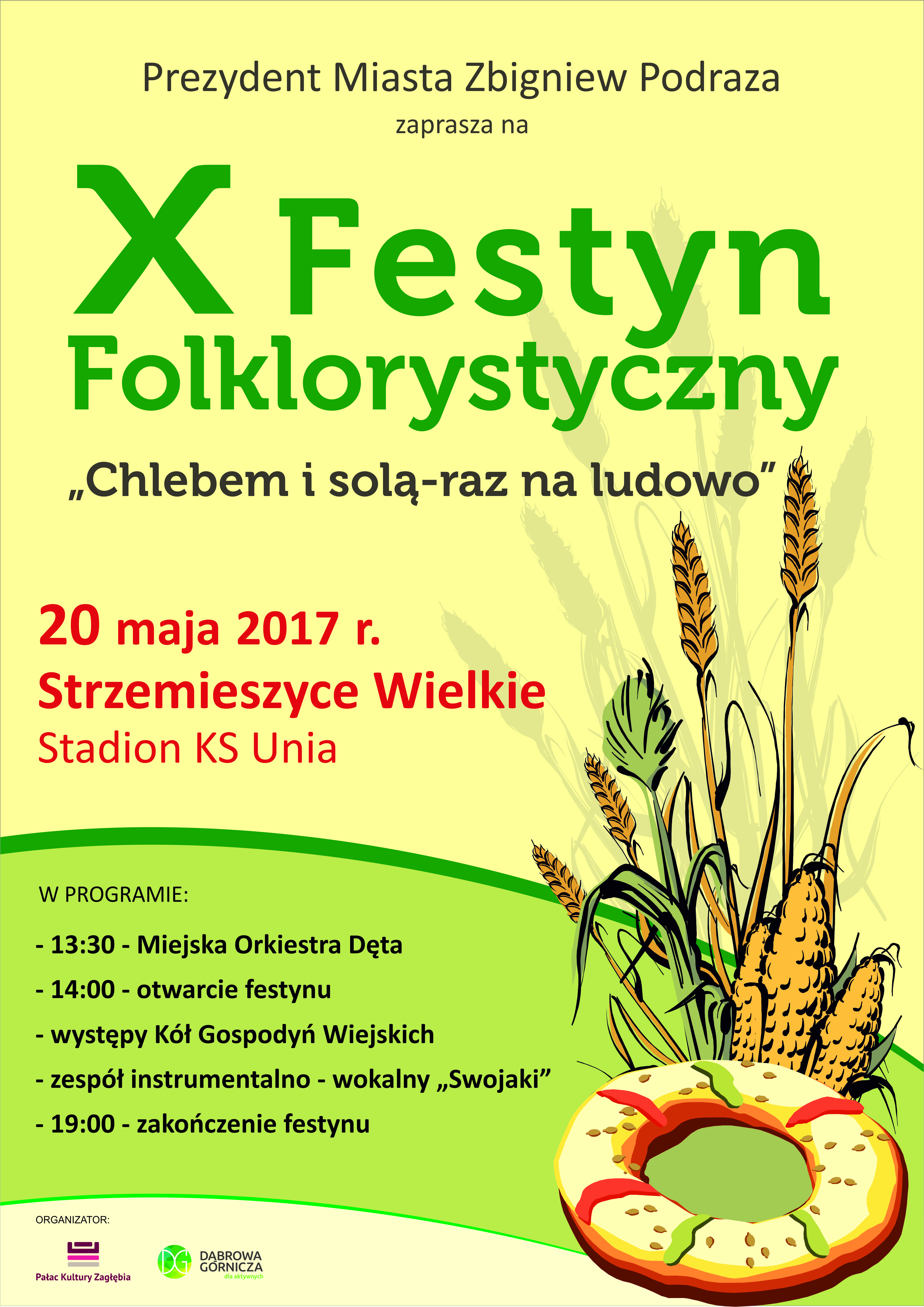 20 maja 2017 r. (sobota) na stadionie KS Unia w Strzemieszycach Wielkich odbędzie się X Festyn Folklorystyczny "Chlebem i solą – raz na ludowo".