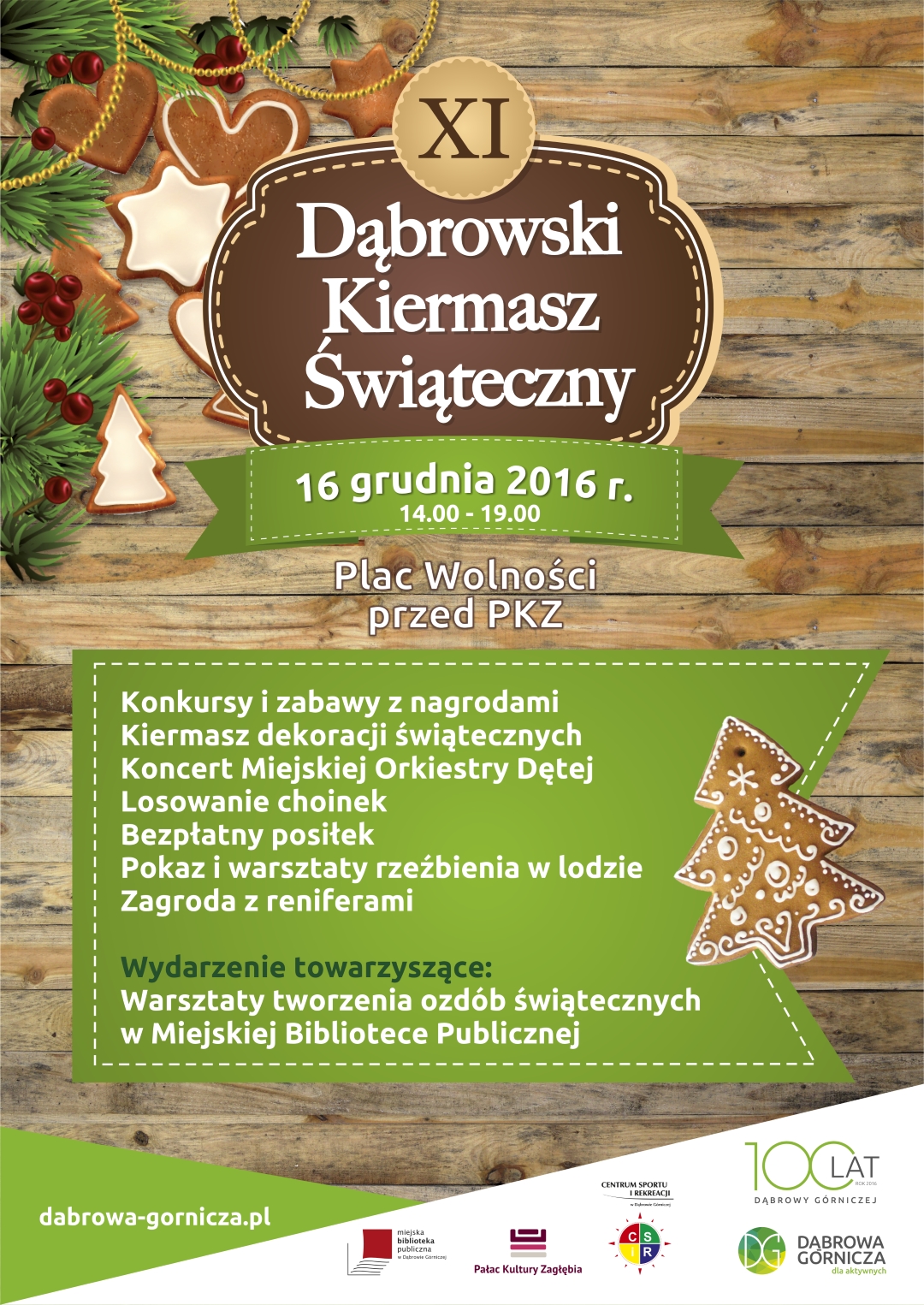 Zbliża się XI Dąbrowski Kiermasz Świąteczny. Zagości on na Placu Wolności przed Pałacem Kultury Zagłębia już 16 grudnia 2016 r. w godz. 14:00 – 19:00. W trakcie kiermaszu będzie można zakupić ręcznie robione dekoracje świąteczne stworzone przez uczniów dąbrowskich placówek oświatowych, członków stowarzyszeń i fundacji działających na terenie miasta. Każdy mieszkaniec, który tego dnia dokona zakupu dowolnego świątecznego artykułu otrzyma kupon uprawniający do udziału w loterii, w której można wylosować żywą choinkę.