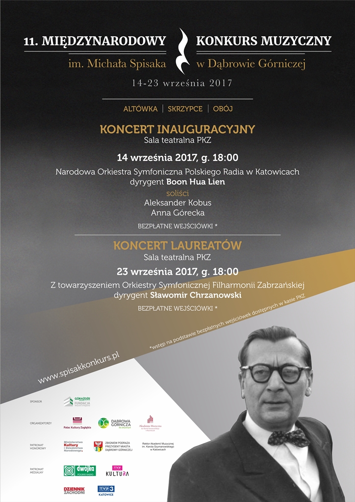 XI Międzynarodowy Konkurs Muzyczny im. Michała Spisaka zostanie zainagurowany 14 września o godzinie 18:00 koncertem w wykonaniu Narodowej Orkiestry Symfonicznej Polskiego Radia w Katowicach pod batutą Boon Hua Liena oraz solistów Aleksandra Kobusa i Anny Góreckiej. Koncert tradycyjnie odbędzie się w Sali Teatralnej Pałacu Kultury Zagłębia.