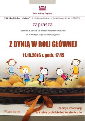 Serdecznie zapraszamy dzieci w wieku 3 - 6 lat wraz z opiekunem na rodzinne zajęcia integracyjne "Z dynią w roli głównej" do Klubu Osiedlowego Helikon.