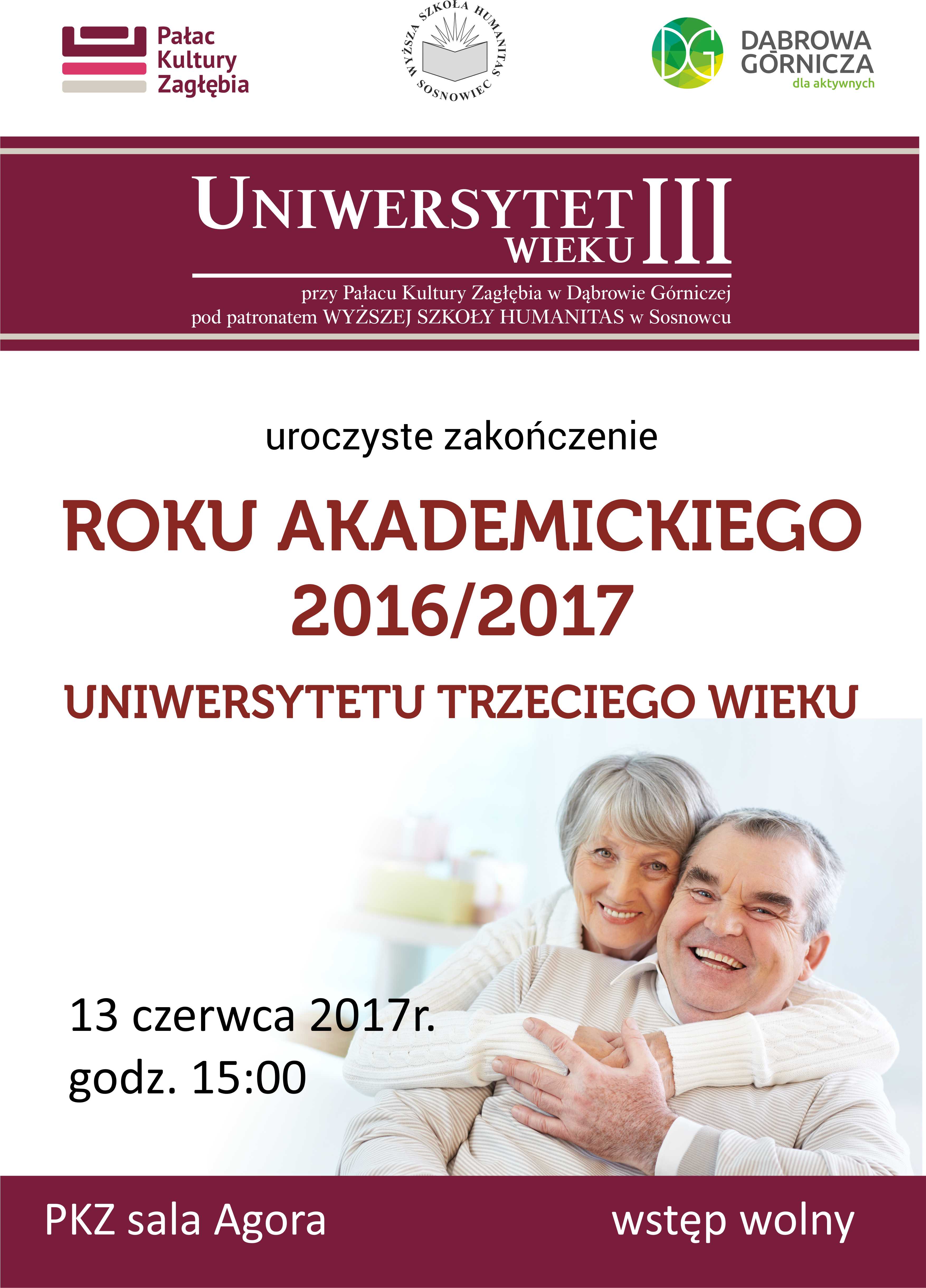 Zapraszamy słuchaczy Uniwersytetu Trzeciego Wieku, ich przyjaciół, rodziny, znajomych oraz wszystkich zainteresowanych na zakończenie pełnego wrażeń Roku Akademickiego 2016/2017. Uroczystość odbędzie się 13 czerwca br. (wtorek) o godzinie 15.00 w Sali Agora Pałacu Kultury Zagłębia. Wystąpi sekcja muzyczna oraz taneczna UTW, a także Chór UTW "Zielona Nadzieja".