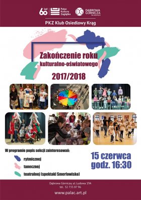 Wakacje zbliżają się wielkimi krokami, więc czas na zakończenie roku kulturalno-oświatowego. Po całym roku szlifowania swych talentów, pasji i umiejętności dzieciaki z sekcji zainteresowań zaprezentują efekty swej pracy. Na scenie Klubu Krąg zaprezentują się sekcje: taneczna, rytmiczna i teatralna. Zapraszamy 15 czerwca, godzina 16.30.