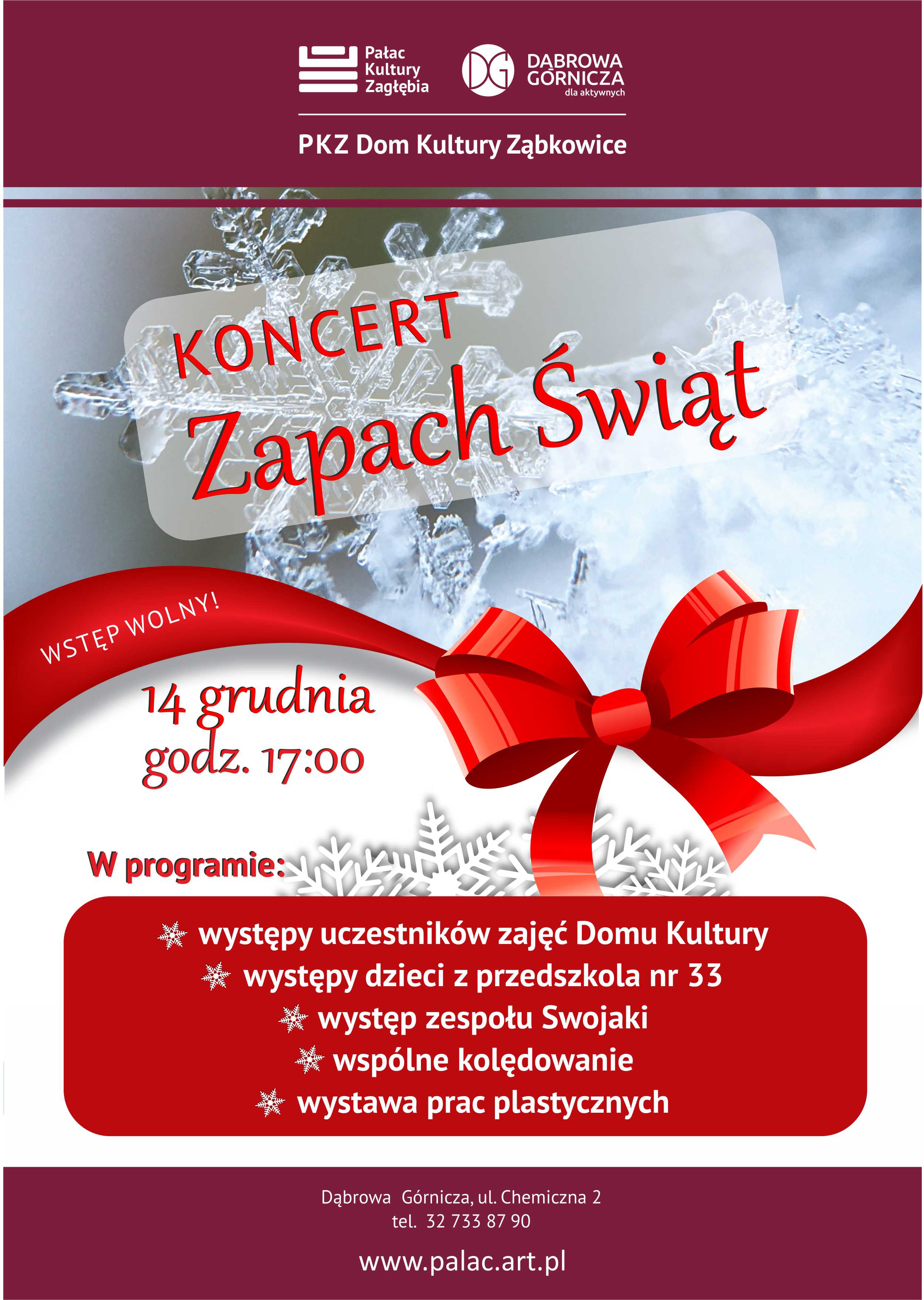 Koncert Zapach Świąt odbędzie się 14 grudnia o godz. 17:00. W atmosferze radości, ciepła i wzajemnej życzliwości usłyszymy kolędy i piosenki świąteczne, które przybliżą atmosferę zbliżających się świąt. Wykonawcami tego niezwykłego popołudnia będą uczestnicy zajęć, zespoły działające w DKZ, dzieci z Przedszkola nr 33 w Ząbkowicach, zespół Swojaki, a dodatkowo odbędzie się także wystawa prac plastycznych uczestników zajęć.