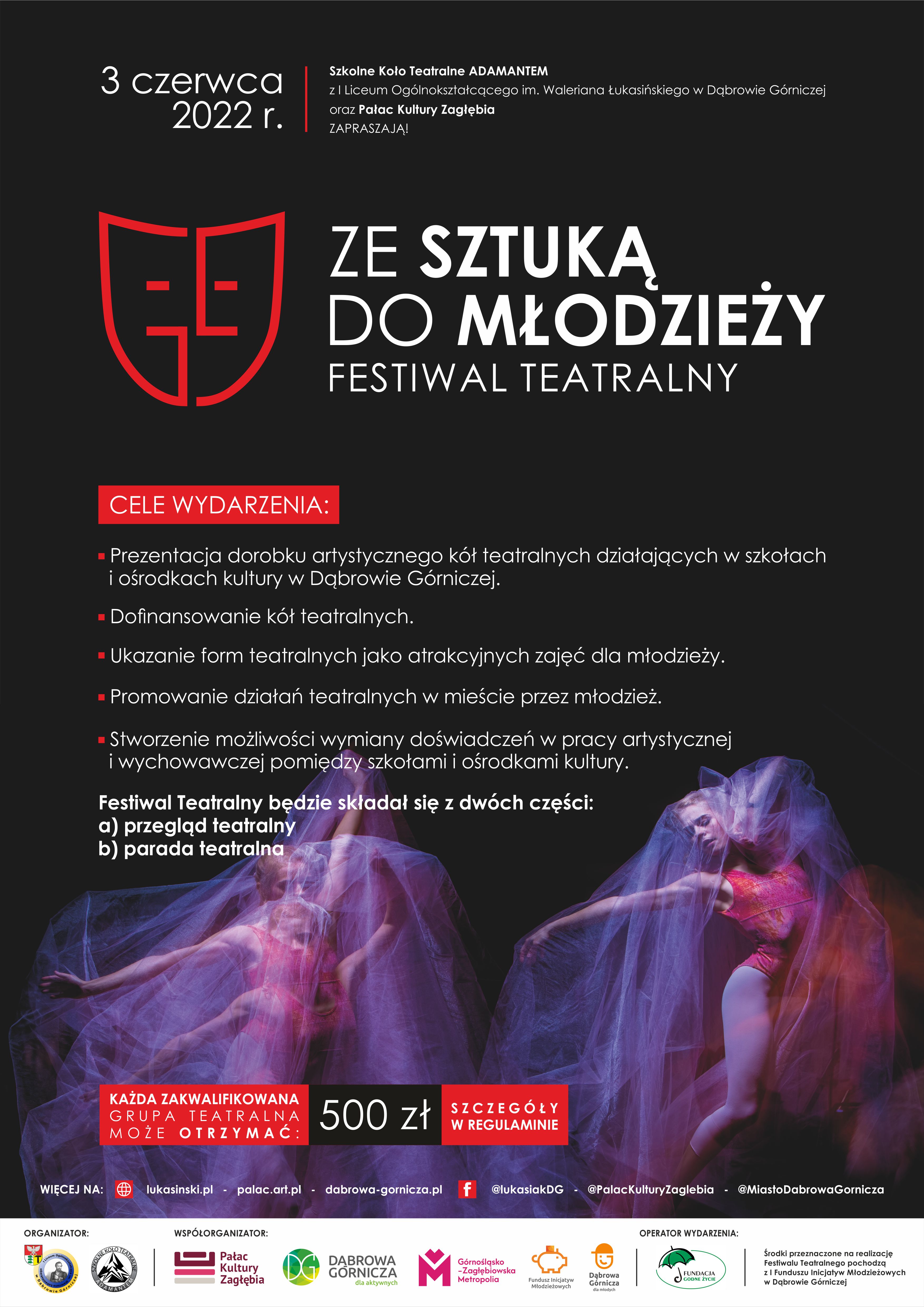 3 czerwca w Pałacu Kultury Zagłębia odbędzie się Festiwal Teatralny Ze Sztuką do Młodzieży! Festiwal będzie składał się z przeglądu teatralnego oraz teatralnej parady ulicami naszego miasta! Wydarzenie organizowane jest na scenach Sali Teatralnej oraz Piwnicy Teatralnej PKZ przez Szkole Koło Teatralne Adamantem z I LO im. Waleriana Łukasińskiego w Dąbrowie Górniczej oraz Pałac Kultury Zagłębia!