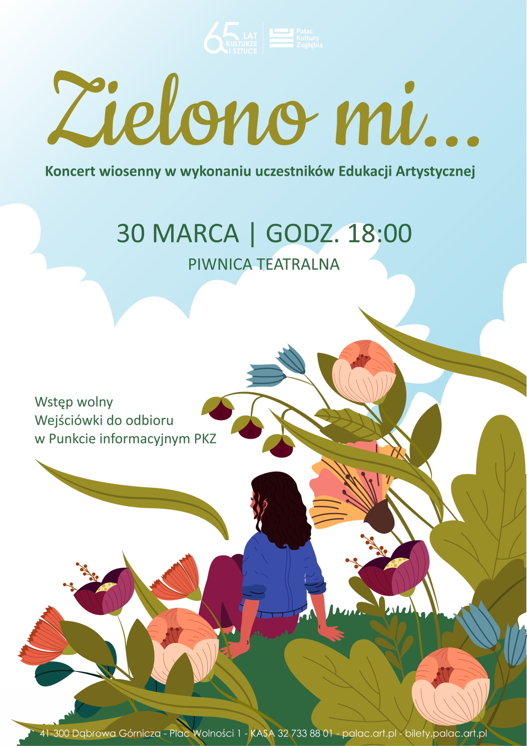 30 marca o 18:00 zapraszamy na koncert wiosenny uczestników zajęć Edukacji Artystycznej Pałacu Kultury Zagłębia, zatytułowany Zielono mi..., który odbędzie się w Piwnicy Teatralnej PKZ.