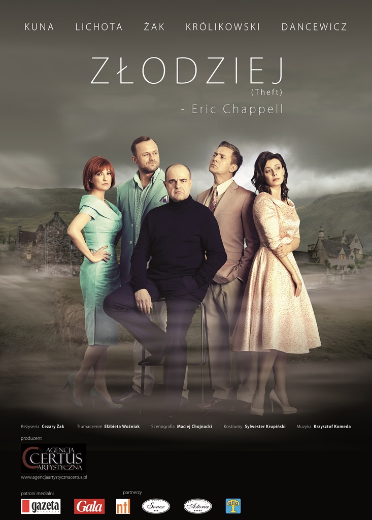 Opis spektaklu: Sprawa jest bardzo mocno podejrzana. Cezary Żak wpada w prawdziwe opały. Przyłapany na gorącym uczynku musi tak zwieść wszystkich domowników; Renatę Dancewicz, Izabelę Kunę Rafała Królikowskiego i Jacka Braciaka, by ci uwierzyli mu, że choć przebywa w obcym domu, wcale nie jest złodziejem. Trudne zadanie? To się dopiero okaże. Zwłaszcza, że przeszukując dom poznał najgłębsze tajemnice mieszkańców. Złodziej z fantazją - psycholog, który wywróci wzajemne relacje mieszkańców do góry nogami. A całe to zamieszanie ma na dodatek wielce nieprzewidywalne zakończenie. Tak z grubsza da się określić punkt wyjścia historii, którą opowiada Eric Chappell w sztuce Złodziej. Autor ten zaliczany jest do grona najlepszych angielskich pisarzy komediowych. Powodzeniem cieszą się nie tylko jego sztuki teatralne. ale także scenariusze filmów i seriali. Sztuka Złodziej tak przypadła do gustu Cezaremu Żakowi, że nie mógł sobie i przy okazji widzom odmówić wyreżyserowania jej i zagrania tytułowej roli. Czy dorównał, w głównej roli złodzieja Spriggsa legendzie polskiej sceny - Janowi Kobuszewskiemu? Najlepiej przekonać się o tym osobiście, wybierając się na spektakl. Bowiem Złodziej to doskonała gra aktorska, wyśmienita zabawa, błyskotliwe żarty przeplatane brawurowymi zwrotami akcji, a na koniec - zaskakujący finał.